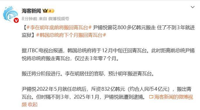 11月12日,据海客新闻,据JTBC电视台报道,韩国总统府将于12月中旬迁回青瓦台。此时距离前总统尹锡悦将总统府搬走青瓦台,仅过去3年零7个月。